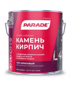 Высококачественный однокомпонентный акриловый лак на основе органических растворителей. Образует долговечное водо-, грязеотталкивающее прочное покрытие, стойкое к эксплуатационным нагрузкам и истиранию. Надежно укрепляет, защищает камень, кирпич, бетон от агрессивного воздействия атмосферных воздействий, перепадов температур, влаги. Препятствует образованию микротрещин, солевого налета, коррозии. Создает на поверхности прозрачную эластичную пленку с высокими декоративными свойствами, сохраняет естественный цвет кирпича и камня, придает поверхностям эффект «мокрого камня».