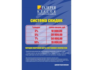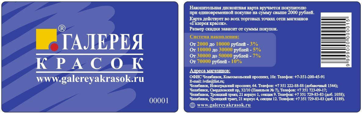 Накопительная дисконтная карта выдается покупателю, в сети магазинов «Галерея красок» при единовременной покупке товара на сумму от 2000 рублей.